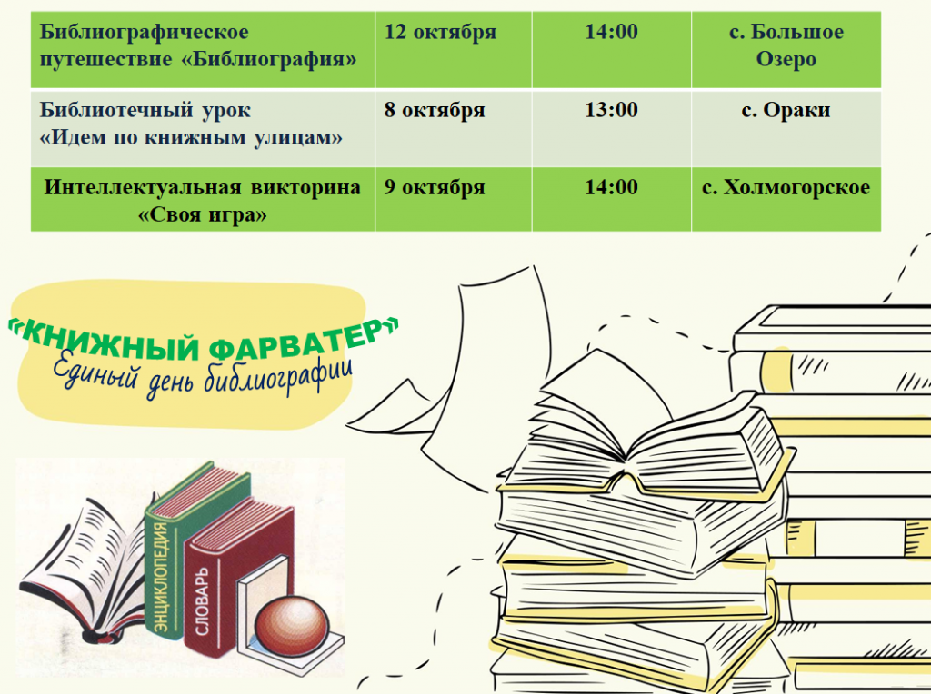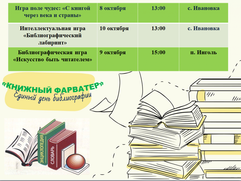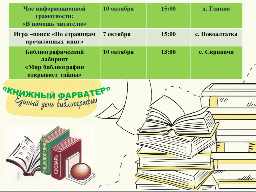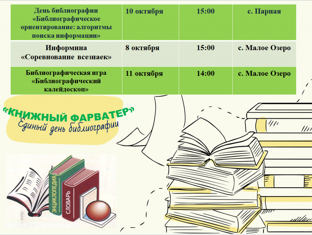 Как найти нужную книгу и не потеряться в море информации? Как эффективно использовать богатство библиотечного фонда? Как сэкономить время на поиск нужных данных? В библиотеках Шарыповского округа с 7 по 12 октября пройдёт Единый день библиографии под названием «Книжный фарватер». Эти мероприятие помогут читателям познакомиться со справочно-поисковым аппаратом библиотек и научиться ориентироваться в универсальной информационно-поисковой системе. Представляем вашему вниманию афишу мероприятий ко дню библиографии, которые пройдут в библиотеках нашего округа.