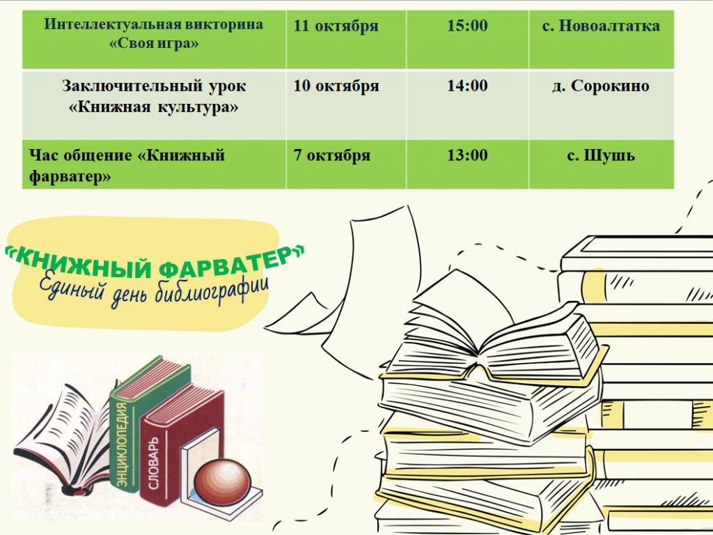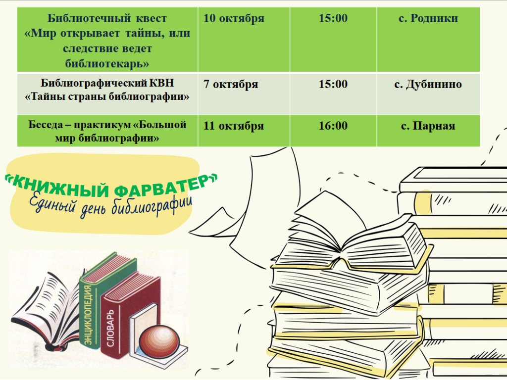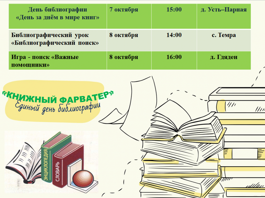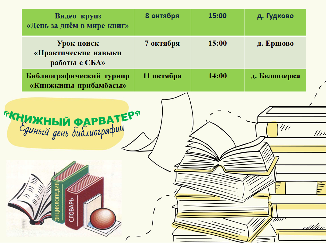 Как найти нужную книгу и не потеряться в море информации? Как эффективно использовать богатство библиотечного фонда? Как сэкономить время на поиск нужных данных? В библиотеках Шарыповского округа с 7 по 12 октября пройдёт Единый день библиографии под названием «Книжный фарватер». Эти мероприятие помогут читателям познакомиться со справочно-поисковым аппаратом библиотек и научиться ориентироваться в универсальной информационно-поисковой системе. Представляем вашему вниманию афишу мероприятий ко дню библиографии, которые пройдут в библиотеках нашего округа.