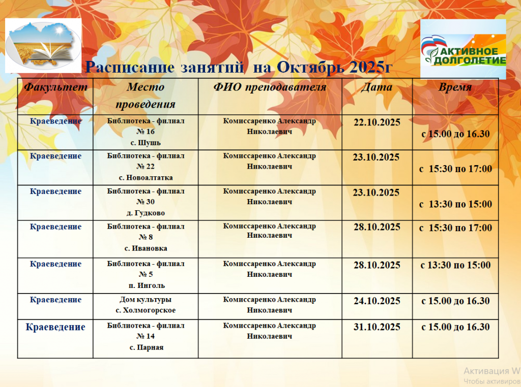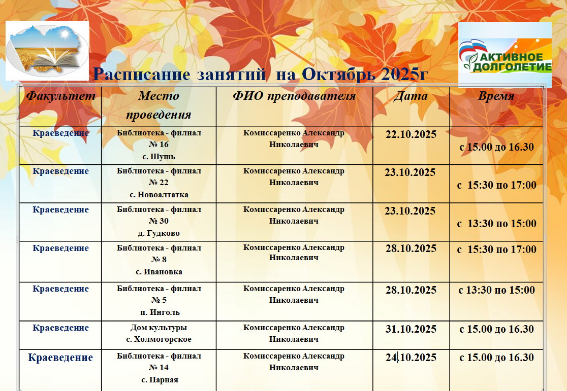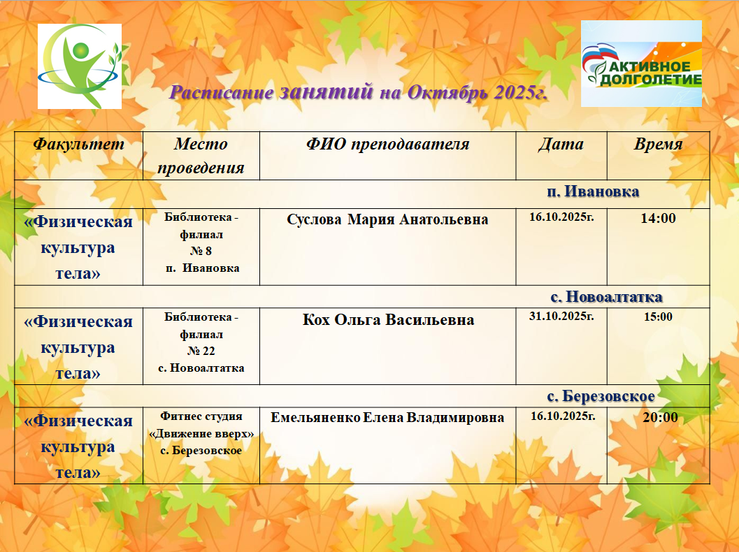 Представляем вашему вниманию расписание факультетов «Краеведение» и «Физическая культура тела» на октябрь месяц.