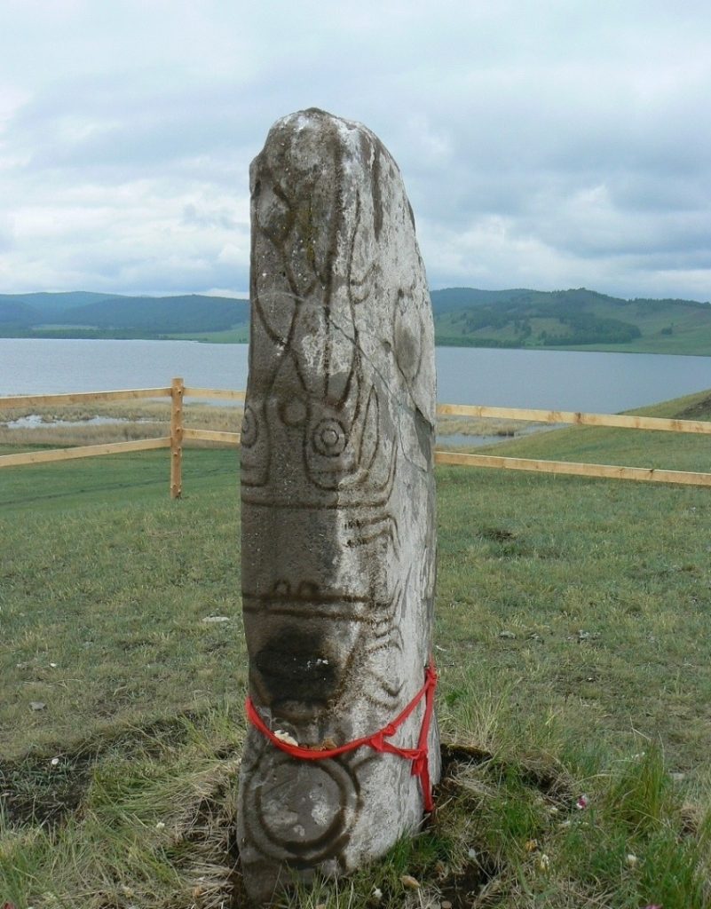 Нашел ее и восстановил археолог Сергей Краснолуцкий, проводивший раскопки на южной границе Красноярского края. Дева Тигер Тас Обаа – Изваяние Небесного Камня – относится к окуневской археологической культуре конца III – середины II тыс. до н.э. Экспертиза установила возраст каменной девы – около 3800 лет. Личина девы имеет яйцевидную форму. В верхней зоне изображены три глаза, над глазами расположены рога с небольшими отростками. Головной убор со стойками. Под ликом в середине камня находится круг с лучами – солярный знак.